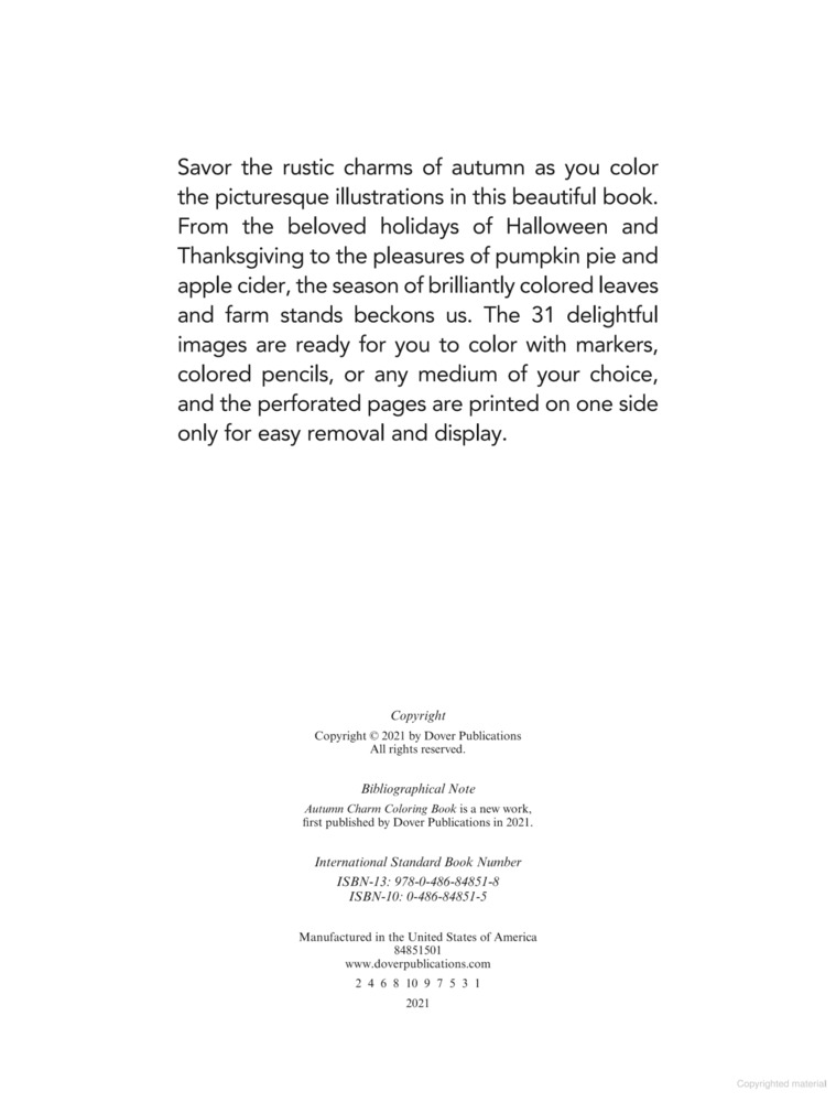 Celebrate fall! In this follow-up to her best-selling Creative Haven Autumn Scenes Coloring Book, Teresa Goodridge has created 31 new picturesque scenes for colorists to love. From carved pumpkins, blooming mums, and country farm stands to harvest wreaths and Halloween-decorated houses, this book is overflowing with beautiful images just waiting for color to bring them to life.