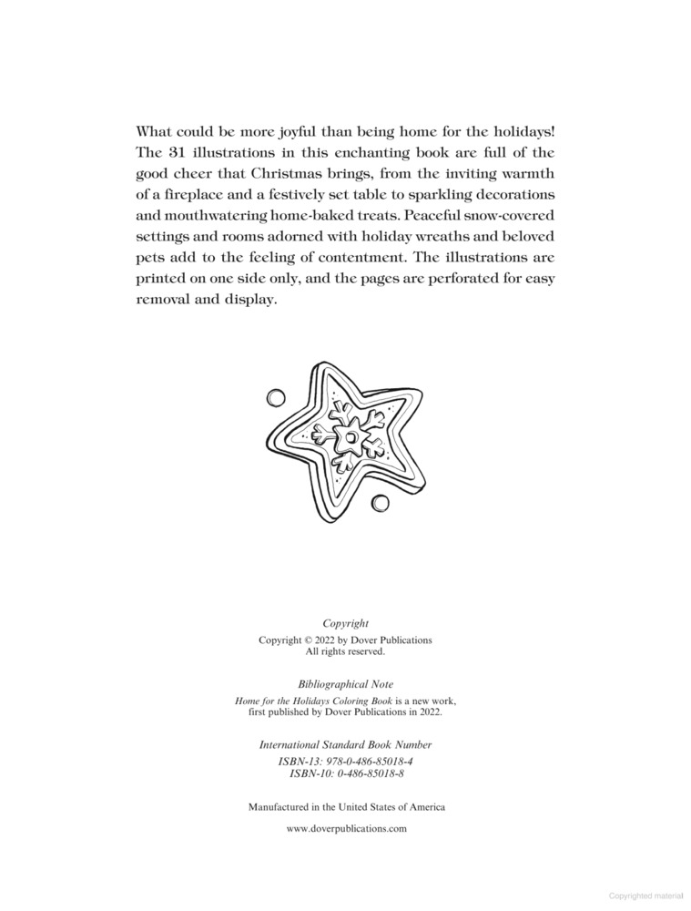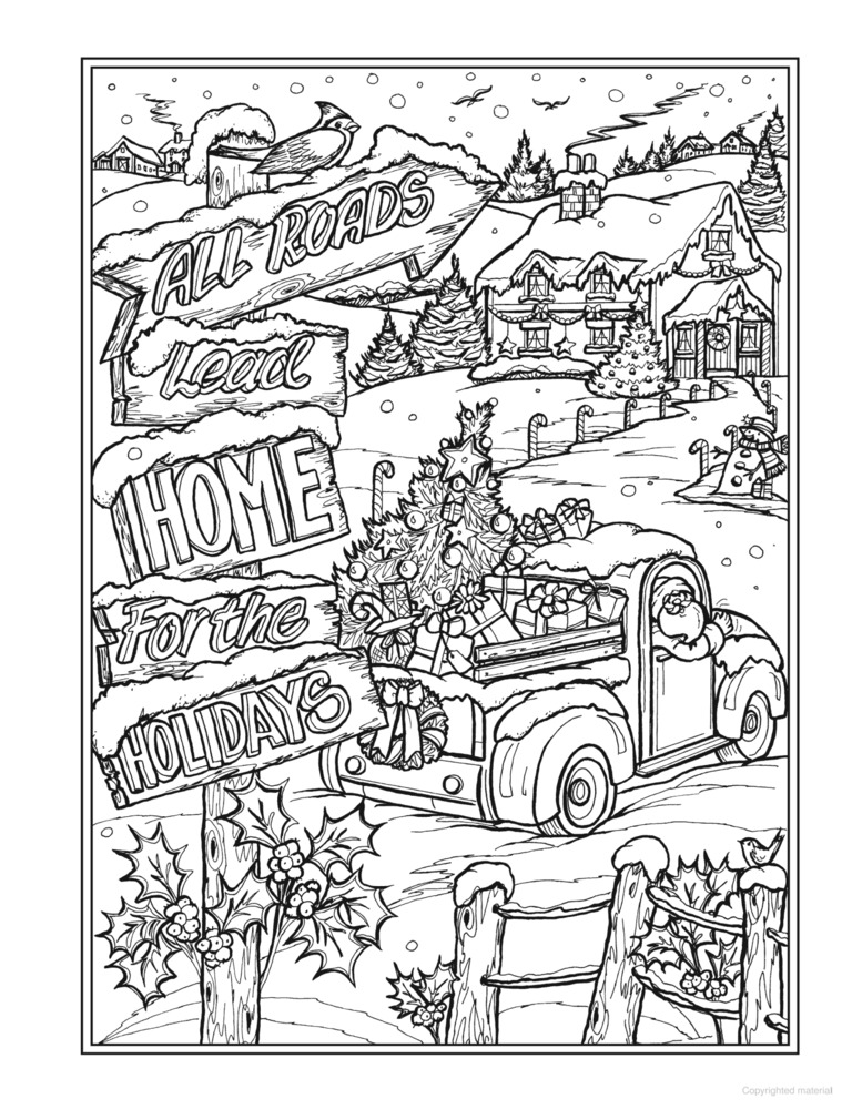 “All roads lead home for the holidays.” This charming coloring book wonderfully captures the joy of celebrating Christmas amid the warmth and comfort of familiar, homey surroundings. The 31 delightful illustrations feature cozy fireside scenes, festive table settings, picturesque snowy landscapes, and beautifully decorated homes and trees, plus cheery designs with fun phrases.