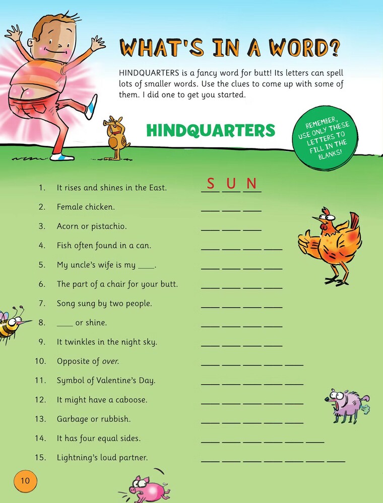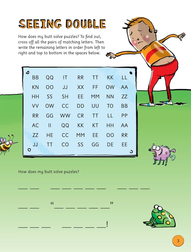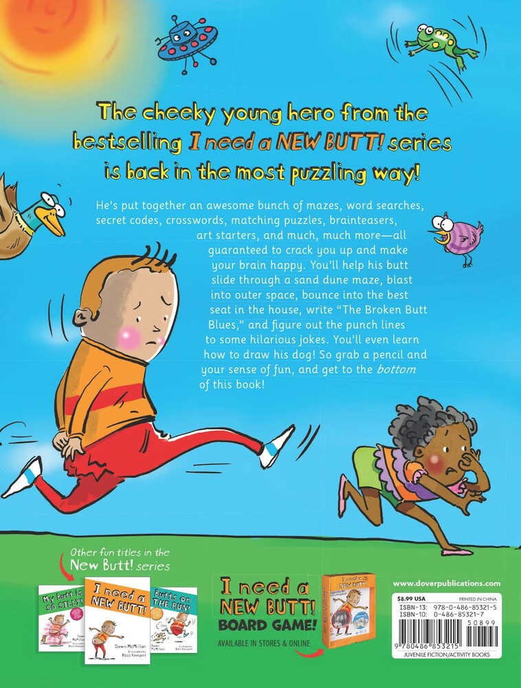 He’s put together an awesome bunch of mazes, word searches, secret codes, crisscrosses, matching puzzles, brainteasers, art starters, and much, much more — all are guaranteed to crack you up and make your brain happy. You’ll help his butt slide through a sand dune maze, blast into outer space, bounce into the best seat in the house, write “The Broken Butt Blues,” and figure out the punchlines to a buttload of hilarious jokes. You’ll even learn how to draw his dog! So grab a pencil and your sense of fun, and get to the bottom of this book!