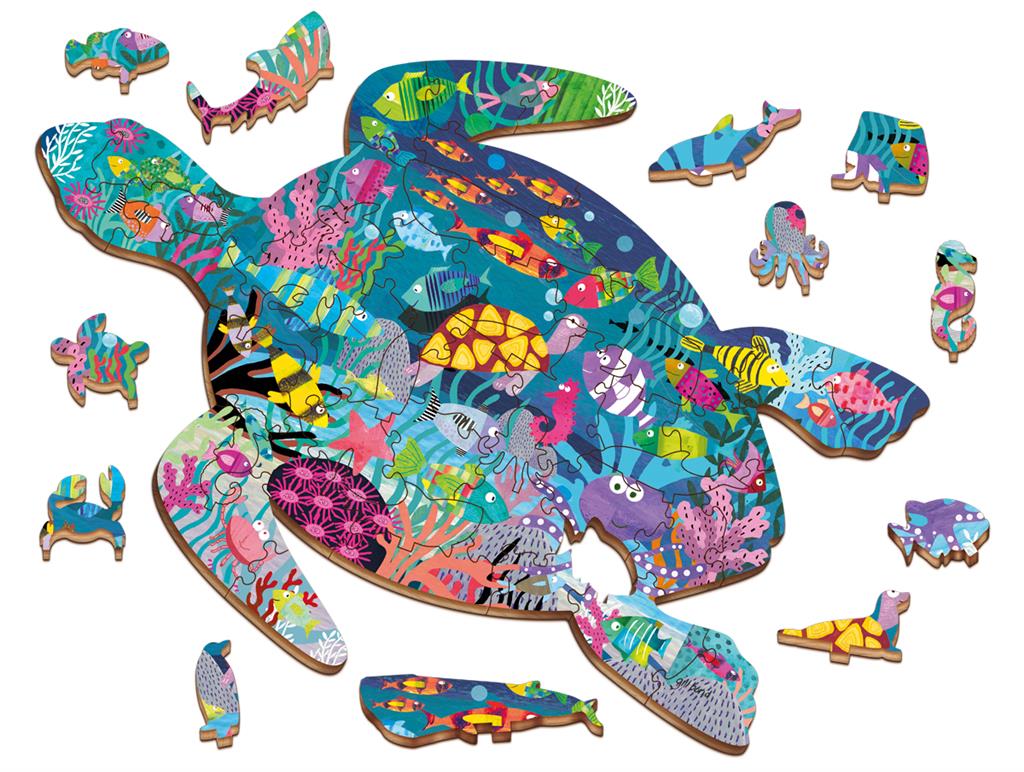 A specially shaped wooden puzzle illustrated with a colorful ocean landscape. Among the pieces that make up the puzzle, 12 preformed animals can be positioned, even standing up, on special supports. This puzzle stimulates logic, visual-spatial skills and fine dexterity. .