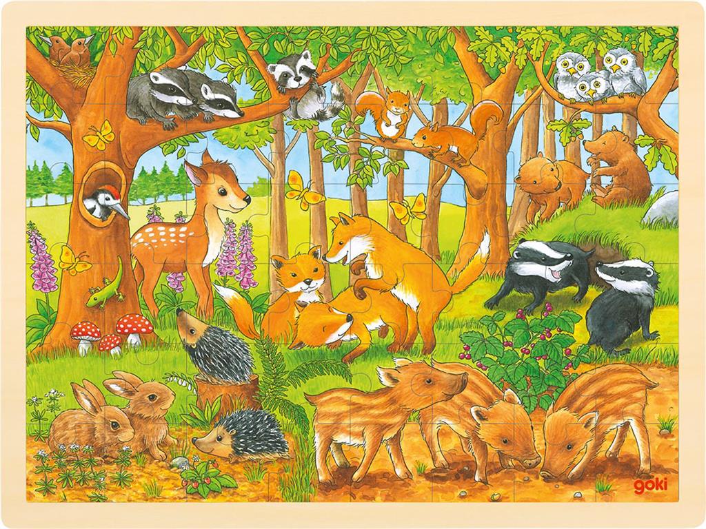 Playful forest animal babies in a 48 piece wooden tray puzzle.