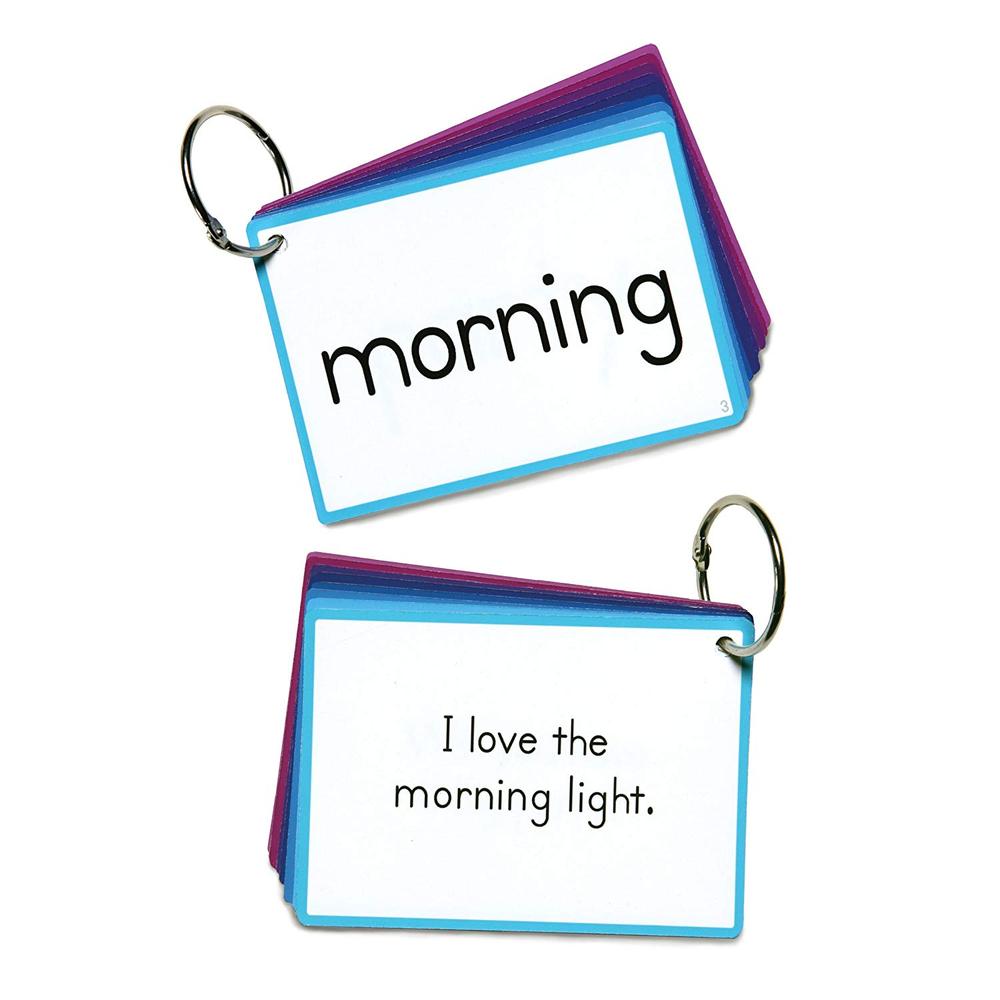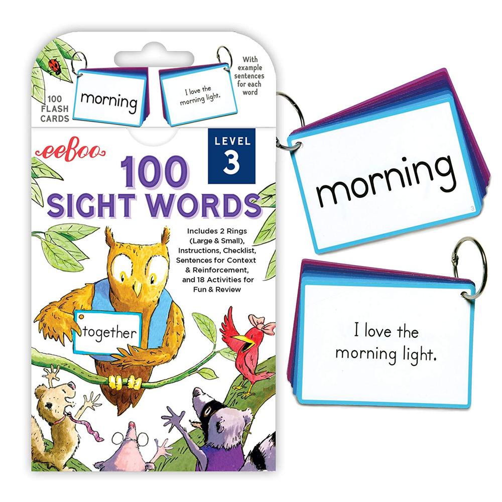 Sight Word flash cards include 100 high frequency word flash cards, 18 learning activities, instructions, a checklist, and two rings to help children move through the deck of 100 cards by level. Level 3 includes high frequency simple words for children to learn through memorization, creating a foundation for literacy. Each flash card has the Sight Word on the front and a sentence to provide context on the back of the card.