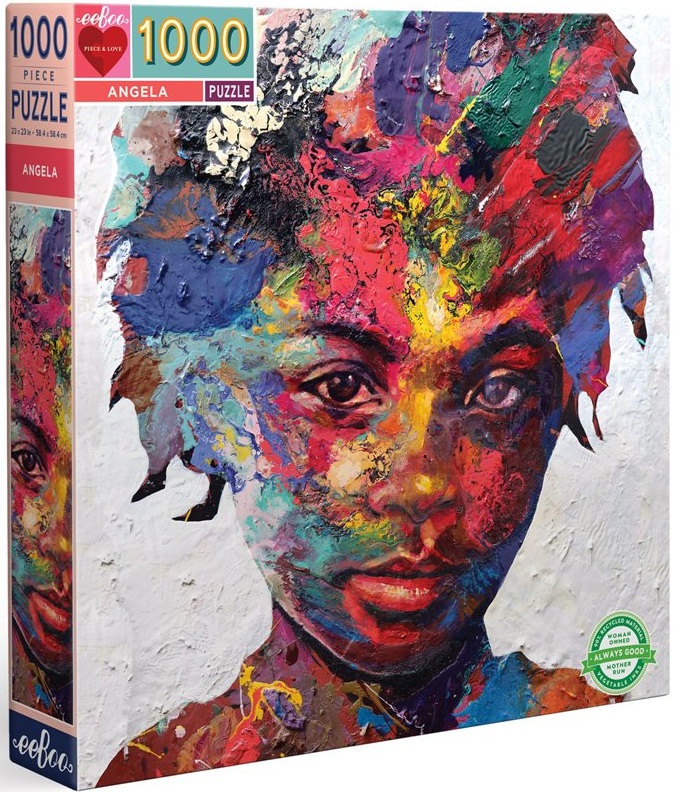 Angela is a beautiful and visually arresting image from our 1000 piece puzzle collection. The artist uses thickly layered paint on a canvas made of found objects and scrap metal to create poignant portraits of people he photographs on the streets of London. This challenging puzzle features the work of the talented artist Matt Small, who describes his subjects as “young, dispossessed people, individuals who feel undervalued, who do not have a voice and who are often overlooked.”