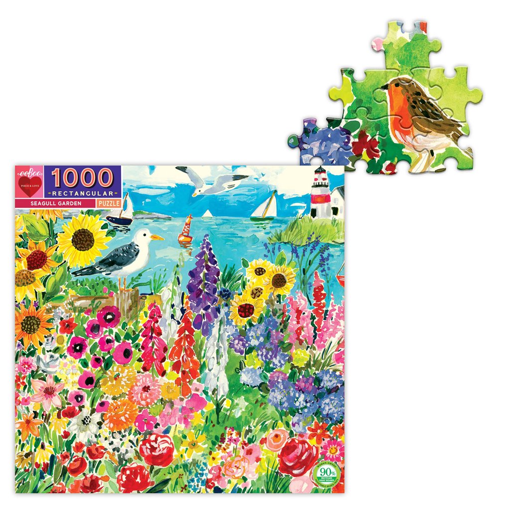 Puzzle your way through a beautiful Seaside Garden. Discover seashells, starfish, lobsters, and flourishing blooms. 1000 Piece Puzzles are perfect for the whole family to enjoy. Illustrated by Jennifer Orkin Lewis.