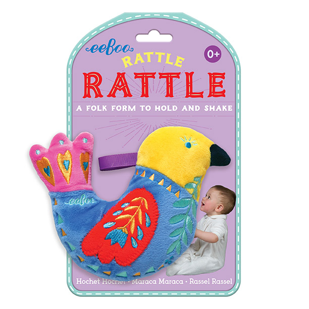 This Bird will rattle if you shake it. Go ahead, you will not break it! Good to grab and fun to shake, (plus some noise for goodness sake!) This rattle’s bright and soft to hold, a classic toy that’s never old.