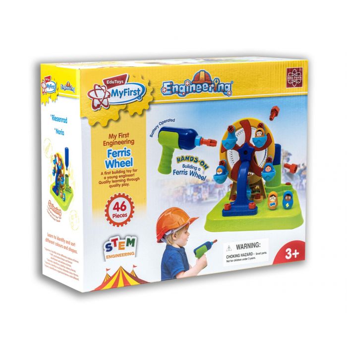 Build a Ferris wheel! Teaches hand-eye coordination in a fun way. Build the electric screwdriver, then build the Ferris wheel using the screwdriver to lock your pieces into place. After building, the electric screwdriver base can be used to power your playground. Watch your creation come to life and play with the five character-pieces included. Take apart, then build and play over-and-over. Build, learn, and play! A first building toy for a young engineer!