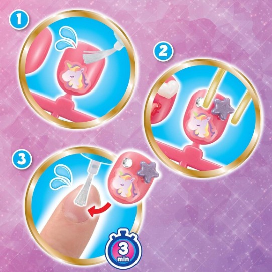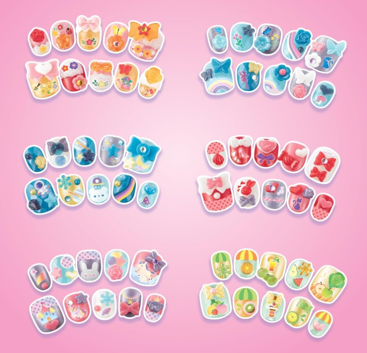 Following the design sheet, create pretty nail designs featuring motifs such as star, ribbon, animal, fruit, flower, and lots more. Using the water applicator, place the decorations on top of the Aquabeads nails to decorate and make them magically stick together! When the creations are completely dried after 3 minutes, carefully take the creation off from the runner so they are ready to wear! Aquabeads nails stay on your fingernails using water, with 3 minutes waiting time. When taking off the creations from your fingernails, gently push up the creations from the side.