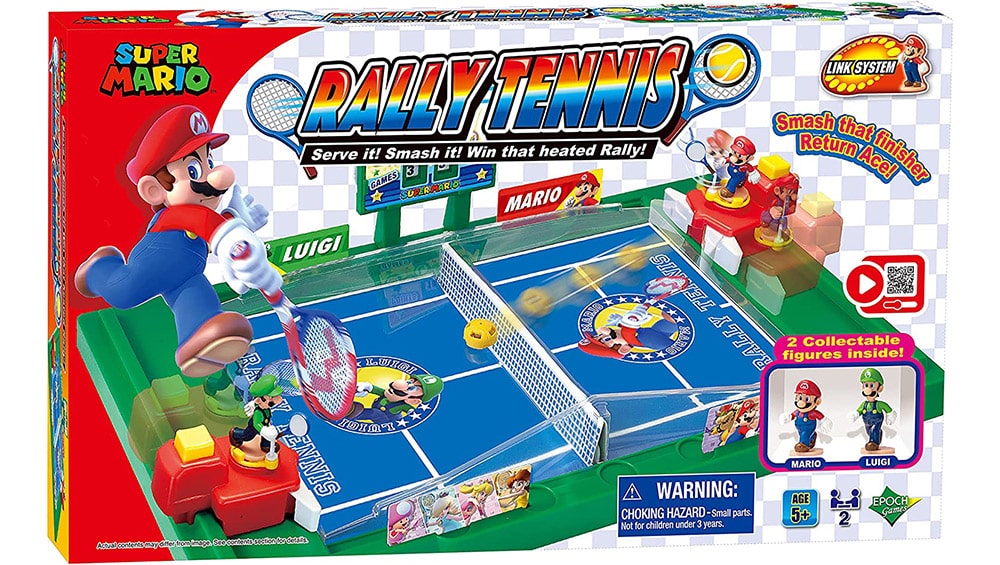 High quality games from Epoch and iconic Super Mario Action Figures come together in the newest line of tabletop action games from Epoch Games. Super Mario Rally Tennis sports action game includes easy-to-assemble tennis court with 2 Super Mario figures including Mario and Luigi and 2 tennis balls. Choose your character and place them onto the controller. Use forehand or backhand by sliding the controller along the groove and pressing the trigger to volley and serve! Manual scoreboad for scorekeeping! Epoch Games Link System allows Super Mario Action Figures from Balancing Games, Blow Up! Shaky Tower and Piranha Plant to play across the range of games including Rally Tennis. Suitable for the whole family, including children ages 5 and older.