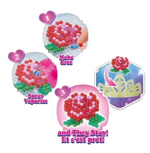 The Disney Pricess Tiara Set comes with 700 beads in 23 colors, template sheets and instructions. Following the template sheet, place the beads onto the tray to create Belle, Rapunzel, Jasmine, and a wearable tiara featuring Beauty and the Beast theme. Using the sprayer, spray water onto the beads to make them magically stick together! When the bead creations are completely dried after 60 minutes, carefully take the creation off from the tray and decorate onto the wearable tiara. You can actually wear the tiara decorated with your creations!