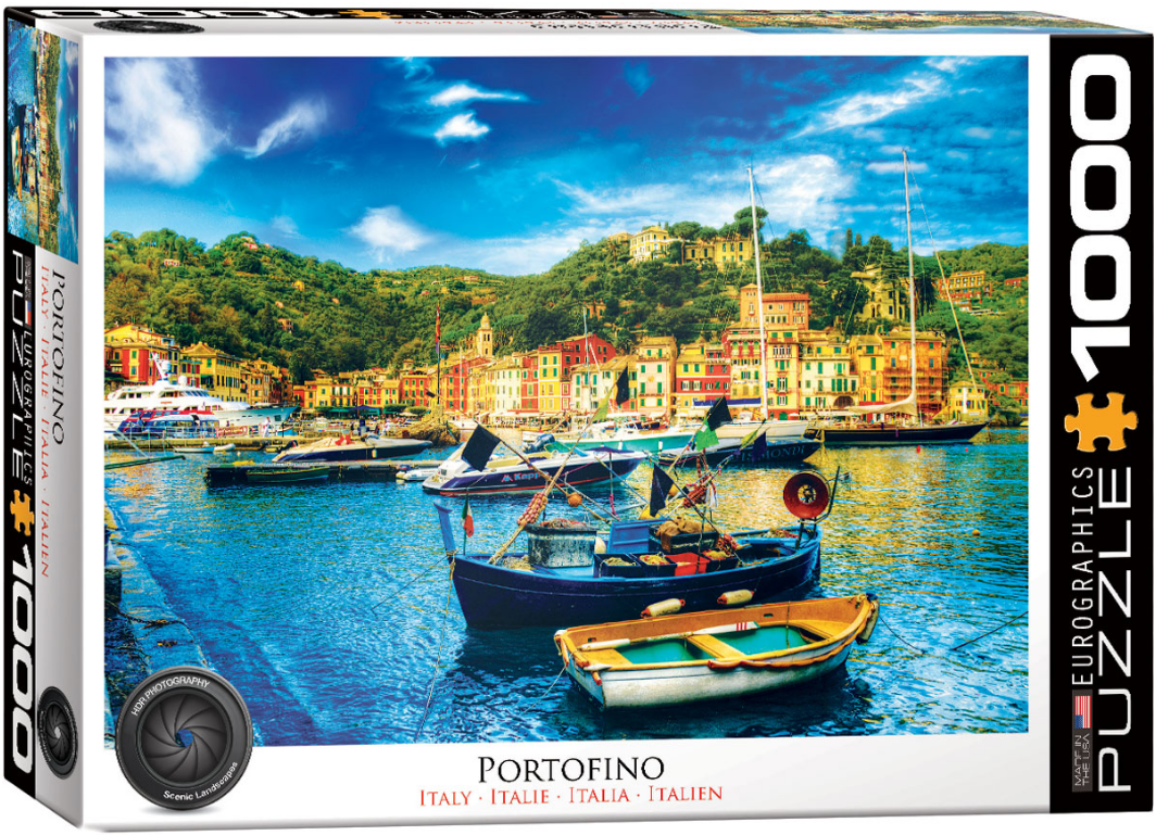 Eurographics Portofino Italy 1000-Piece Puzzle. Box size: 10" x 14" x 2.37". Finished Puzzle Size: 19.25" x 26.5". Portofino is a fishing village in Italy, famous for its picturesque harbour. Strong high-quality puzzle pieces. Made from recycled board and printed with vegetable based ink. This superior quality puzzle will delight and educate all at the same time.