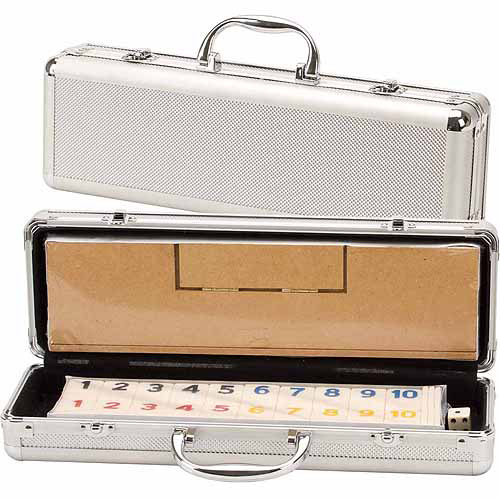 13" x 3" x 2" Aluminum Rummy Case. Wooden racks, tiles and dice are included.