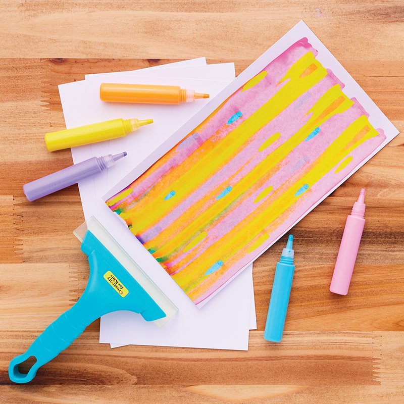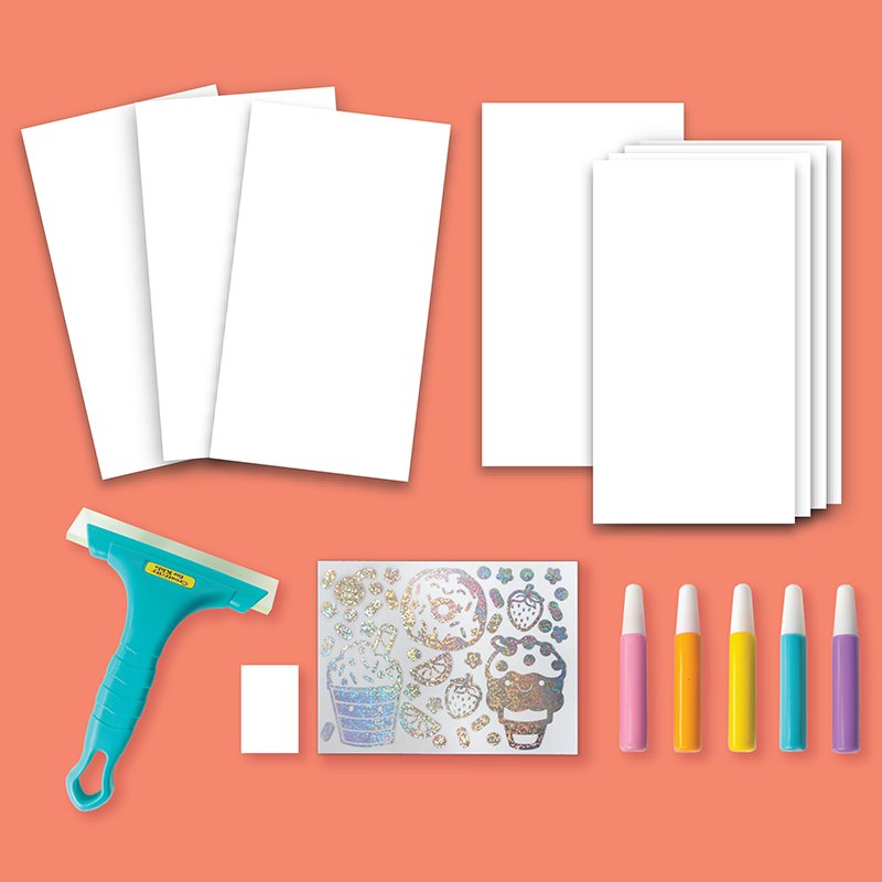 Discover a unique way to paint with Magical Reveal Squeegee Art Kawaii. Young artists can create abstract art simply by applying dots of paint and using the included squeegee to reveal 3 cheerful and cute surprise images. Try different patterns of painting such as zigzag, rainbow, and swirl methods to add texture and effects to your artwork and add the included holographic stickers for an extra special effect.