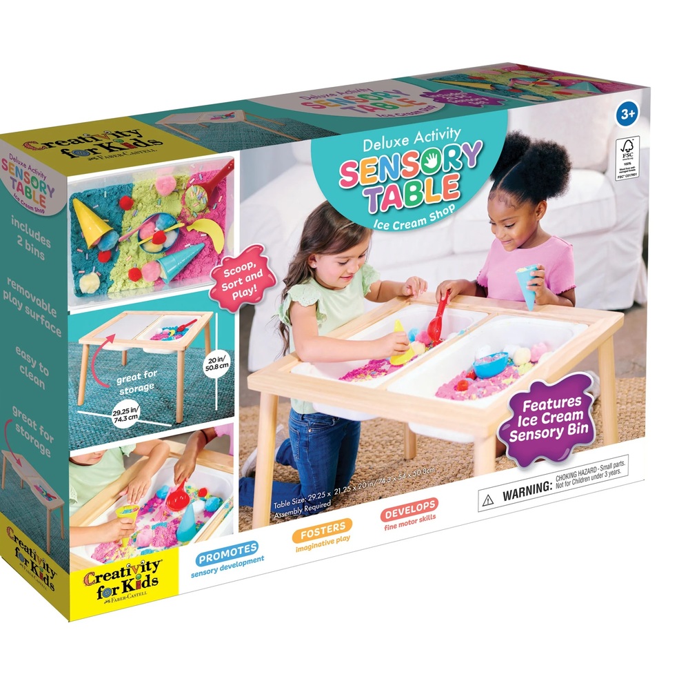 - 1 Sensory Table (Pine Wood & MDF) assembly required 29.25 x 21.25 x 20,” 2 Table top boards, 2 Plastic bins, 3 Colors of sensory sand net wt. 2.5lb total Yellow, Pink and Blue, 1 Ice cream scoop, 1 Bowl, 1 Spoon, Assorted pom poms, 2 Ice cream cones, Rainbow beads, 2 Foam bananas and Instructions