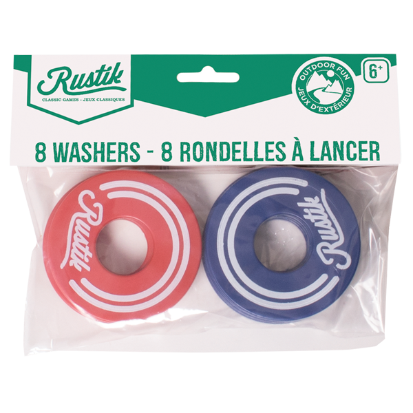 Take the fun outside with this activity game reminiscent of Horse Shoes. Placed at a distance of 21 feet apart, opposing players throw their 5 colored washers into the opponent's toss box in an attempt to accumulate the most points. This refill package of washers contains a set of 8 washers in 2 different colors.