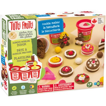 With this set, kids can “bake” cookies that smell like they are fresh out of the oven. Make cookies that look like they came fresh from the bakery. Make them, decorate them, and show them off with the baking tools and cutters. These cookies will never go hard or "stale" thanks to Tutti Frutti's resilient dough formula. The dough is non-toxic, water-based, re-hydratable, and won't stick, stain or crumble. Blend any combination of dough together to make new colors and scents. Play and develop your dexterity and creativity with this Tutti Frutti clay modeling kit. You can also create a color by mixing 2 existing colors. Creative activities like modelling dough have several benefits including increasing confidence, developing motor skills, and exercising imaginations.