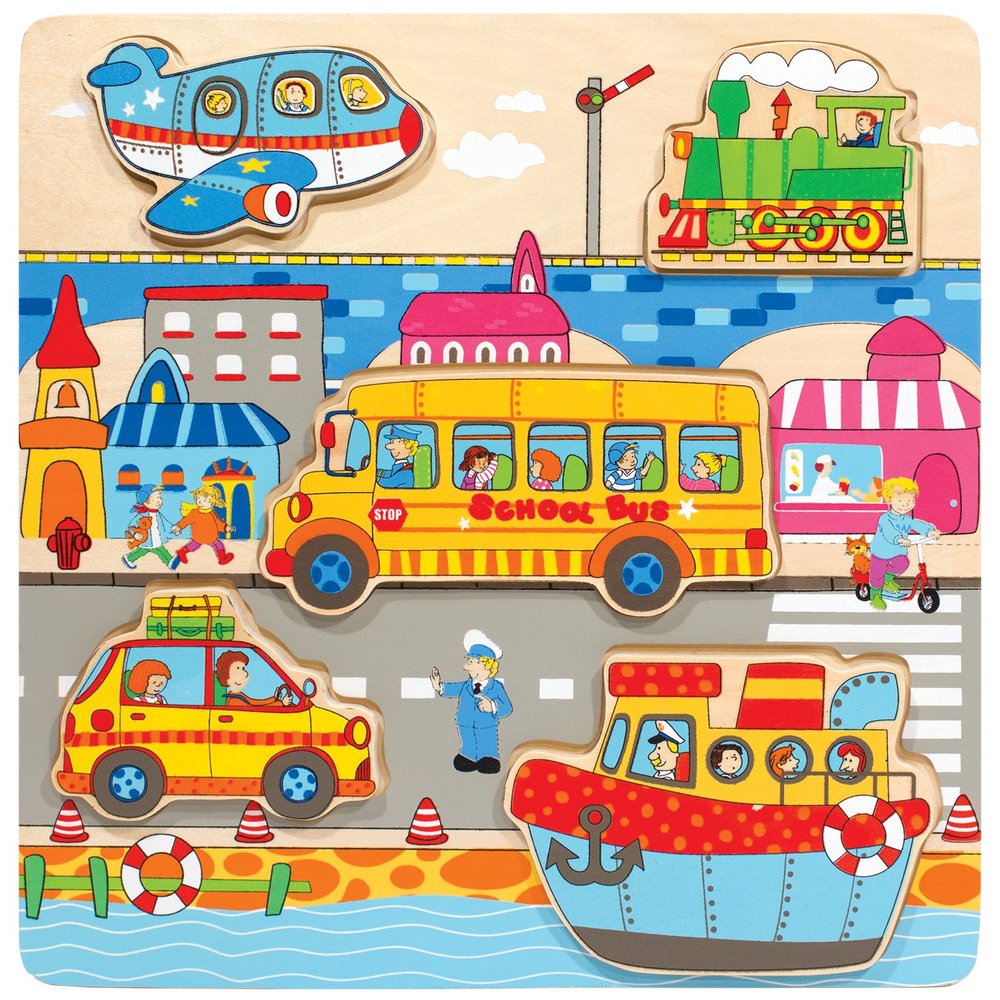 Try to fit the 5 modes of transportation back in the correct spaces within the city scene. Positioning the large wooden pieces, depicting a plane, locomotive, school bus, car and tug boat correctly is the goal.