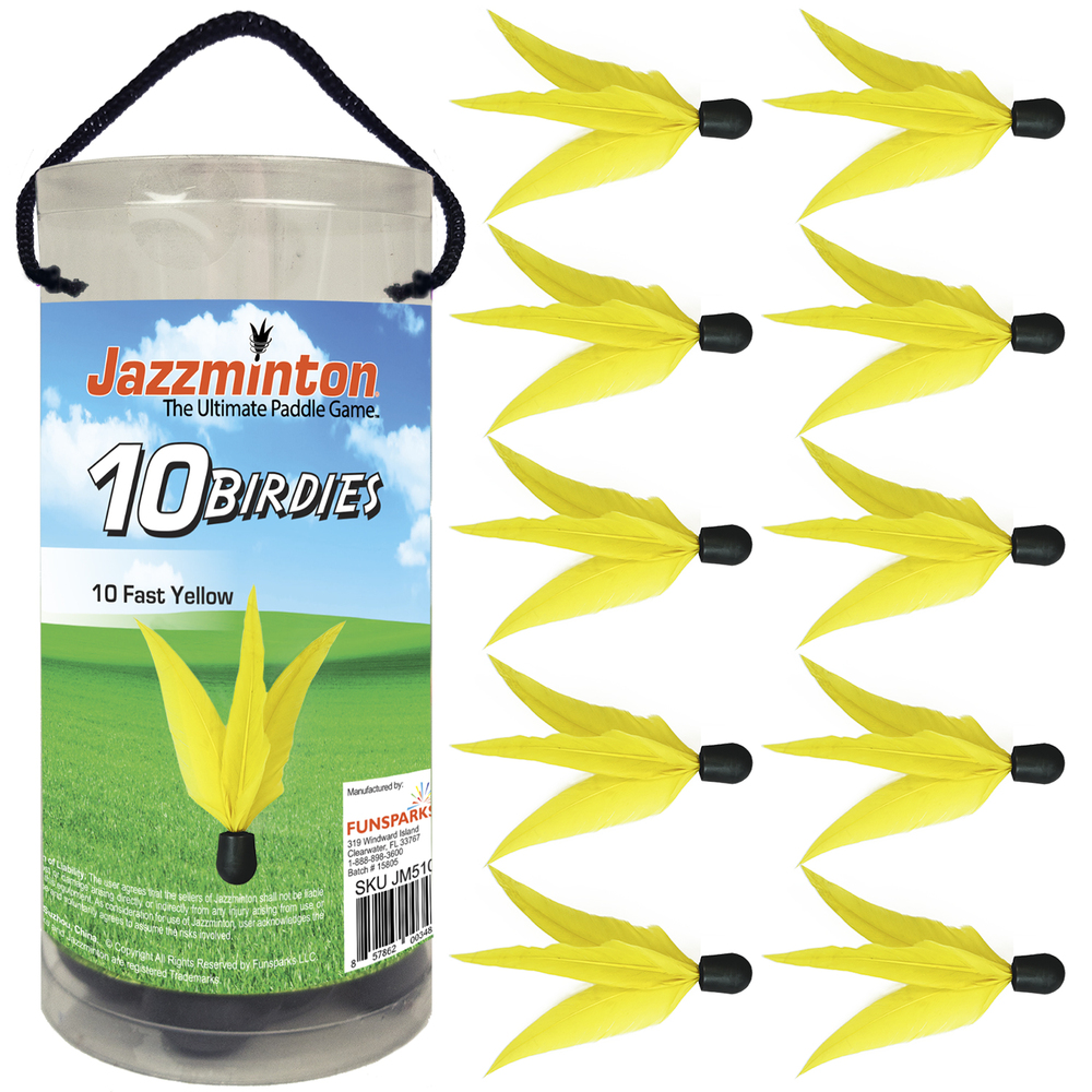 - CONTAINS 10 BIRDIES: 10 yellow fast flying birdies. Jazzminton is a great way to increase hand eye coordination, motor skills and keeps you active
