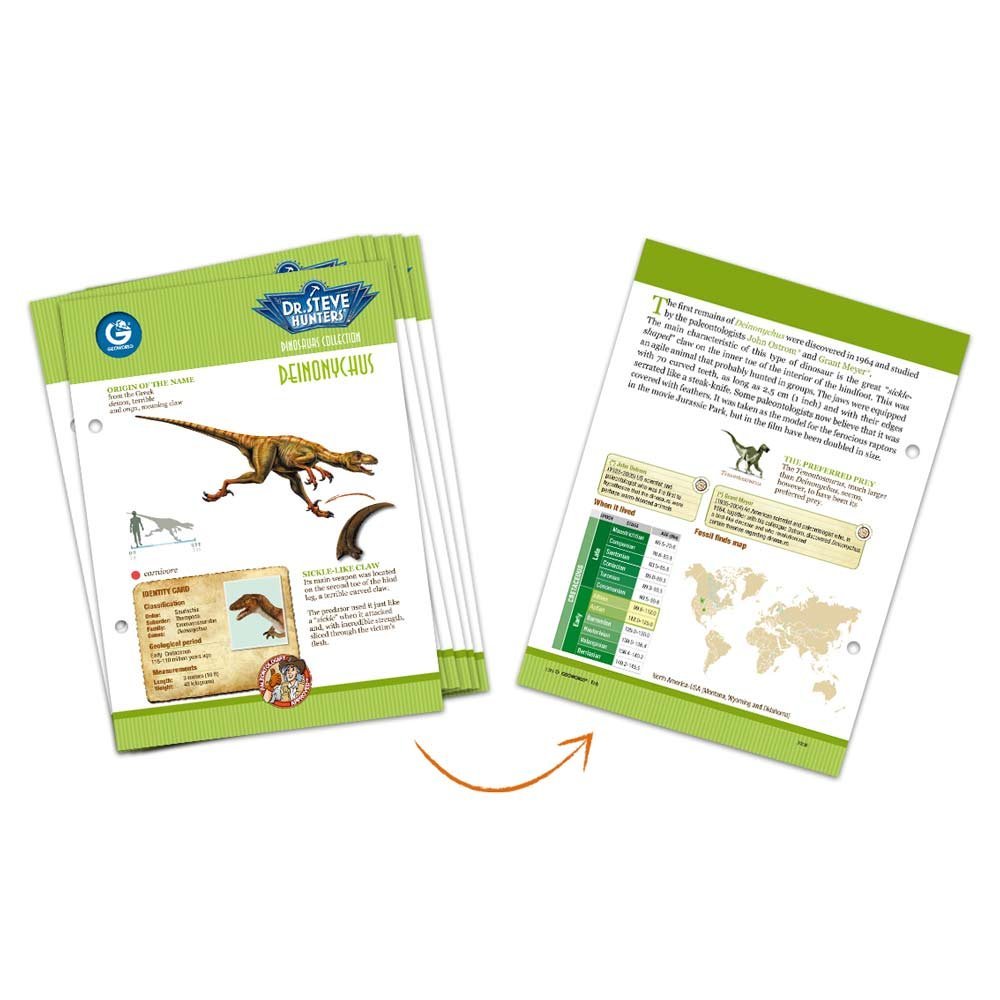 • Collect them all and document your findings by adding the identity card to your field guide, your very own paleontologist’s diary