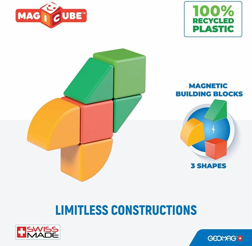 Magicube is a completely new platform, created by Geomag, leading company in the production of magnetic toys. The cubes can all be attached together on any side, and can even be suspended, making it a fun and simple building toy for even the youngest of builders. The Magicube pieces are made in Switzerland, using 100% recycled plastic. Compatible with other Geomag Magicube Sets, sold separately.