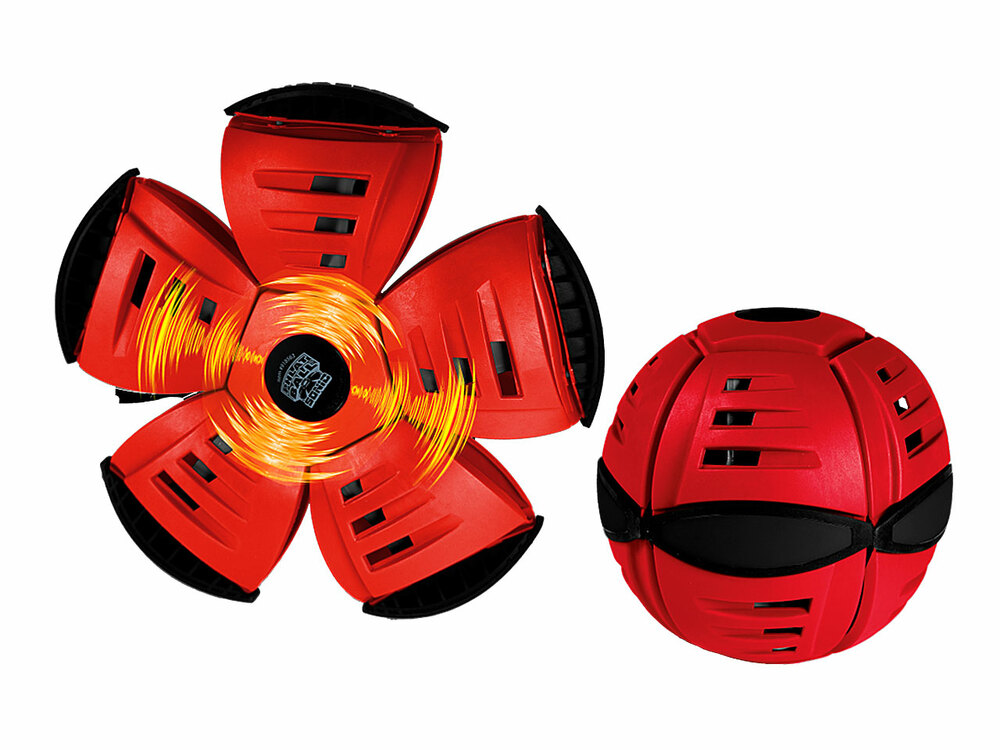 You throw a disc, but catch a ball! This unique flying disc is able to transform itself into a real ball. With special LED lighting effects. Press the top and bottom firmly together and your Phlat Ball is flat! The Phlat Ball automatically pops open into a ball! Do you want to take your Phlat Ball with you? Press it flat and it fits in your bag!