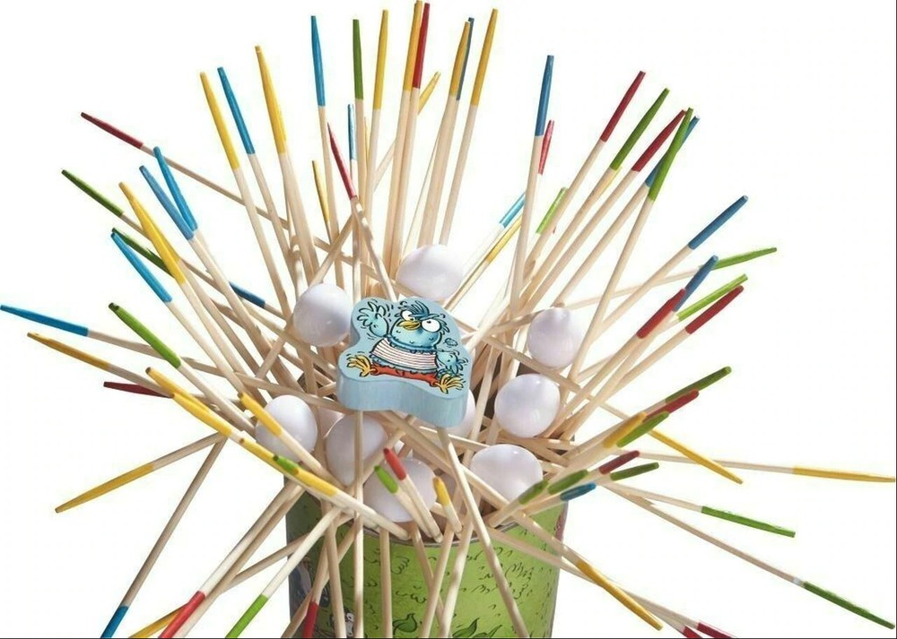 Help Kiki Cuckoo build a nest for her eggs. Be careful! As soon as a few suitable twigs are on the nest you must gently rest a cuckoo egg on top; the fragile eggs may tumble down a half-built nest! It takes finesse and a little luck to be the first to place all of your wooden eggs safely in the nest. The winner is the one who can then securely place the wooden Cuckoo bird on top of the nest of twigs!