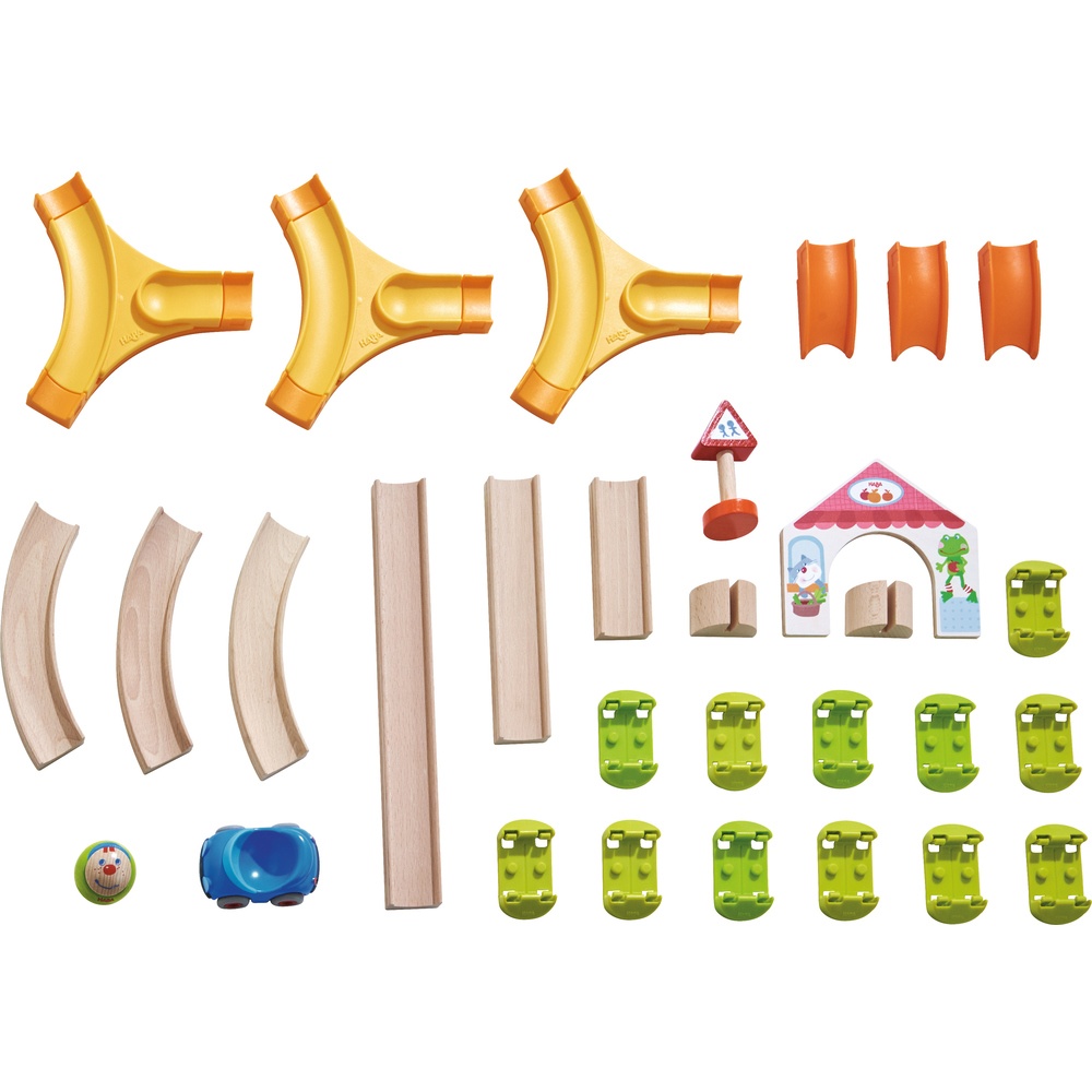 Boundless Kullerbü driving fun with several connection points to which other Kullerbü trains can be easily grown. Even more driving fun with funny ball Pepe Arrow fast and fast-moving blue ball convertible. The Spielbahn Kringel roundabout can be built in three different variants.