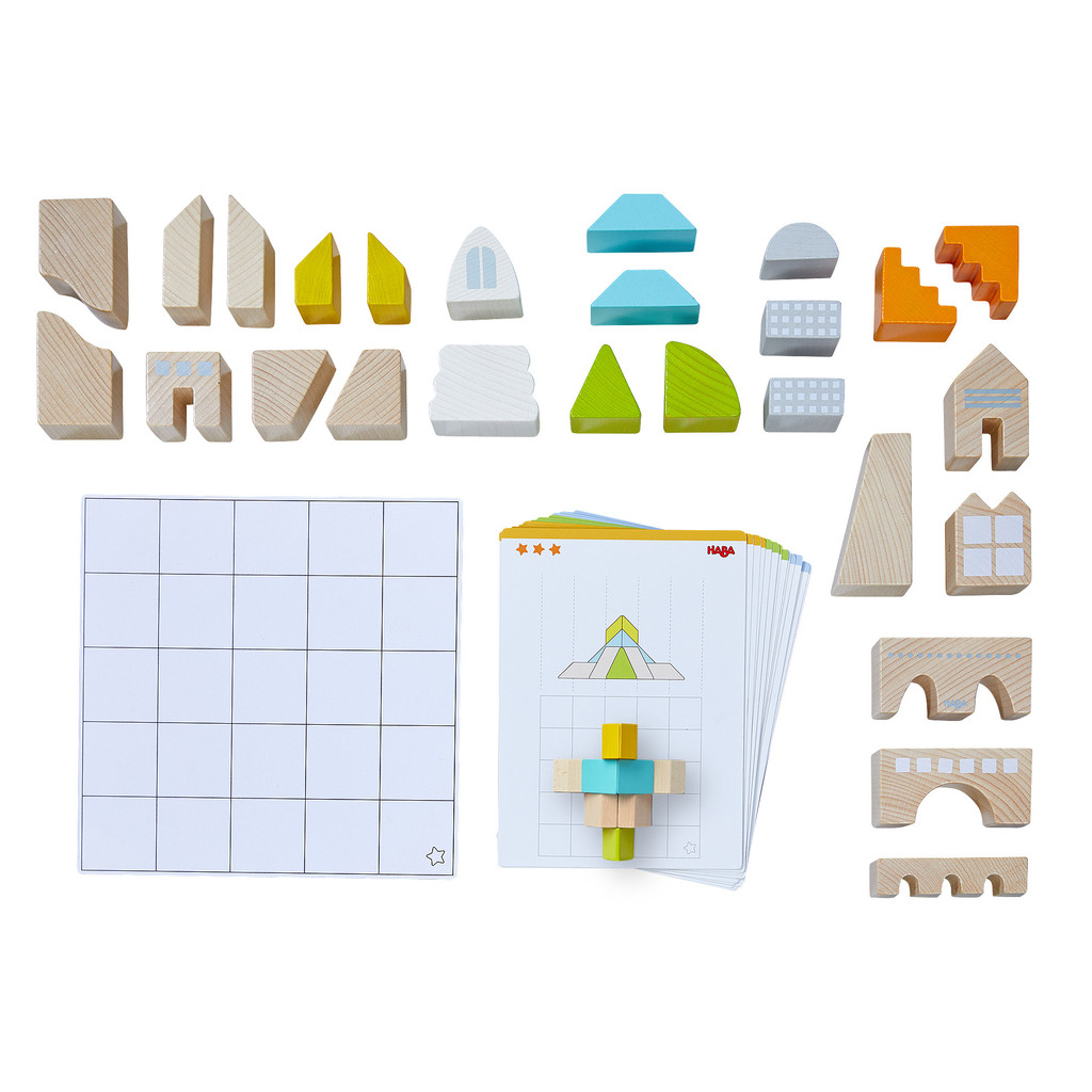 - The set consists of a building plate, 26 building blocks and 16 sample cards printed on both sides