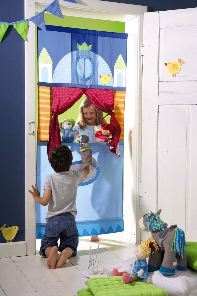 Raise the curtain! Put on a true production with the HABA Doorway Theater! This whimsical set can adjust to fit in different sized door frames. The curtain dimensions are 67" tall and 31" wide, but the poles extend a bit further for larger door frames. Easily set it up and you are ready for hours of puppet fun. 4 telescopic rods fit into the edges of the curtain, giving it a neat and taut appearance. Which play will your little ones perform first? The Doorway Theater stimulates children's imagination and creativity! The theater is wonderfully detailed with a cute porthole at the top for a puppet to make a surprise appearance or introduce the next act, a vibrant red curtain that comes with tie backs to unveil the show, and a little pocket window to display the name of the act!