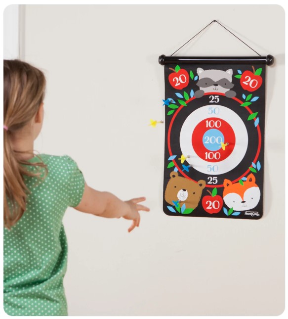 Hang the Double-Sided Magnetic Dartboard from any wall or door, set your sights on the target, and shoot! Different point systems create fun challenges and engage kids to practice their hand-eye coordination. And with two colorful designs (one on each side), this game is double the fun. Made of coated canvas, the board is weather-resistant for outdoor fun. Going on a trip? Take the game with you! The board rolls up and stores away into a sturdy tube. Also perfect for play dates and parties.