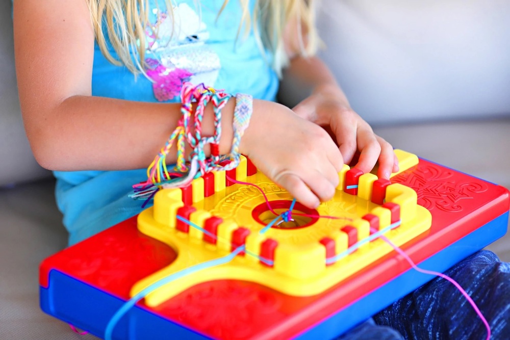 The center lace holder let's kids create both square and cylinder patterns. The S-hook attachment makes it easy to create flat friendship bracelets and lanyards. A telescoping center tube guides the lace down to keep your lanyard straight. This kit is jammed packed with supplies!