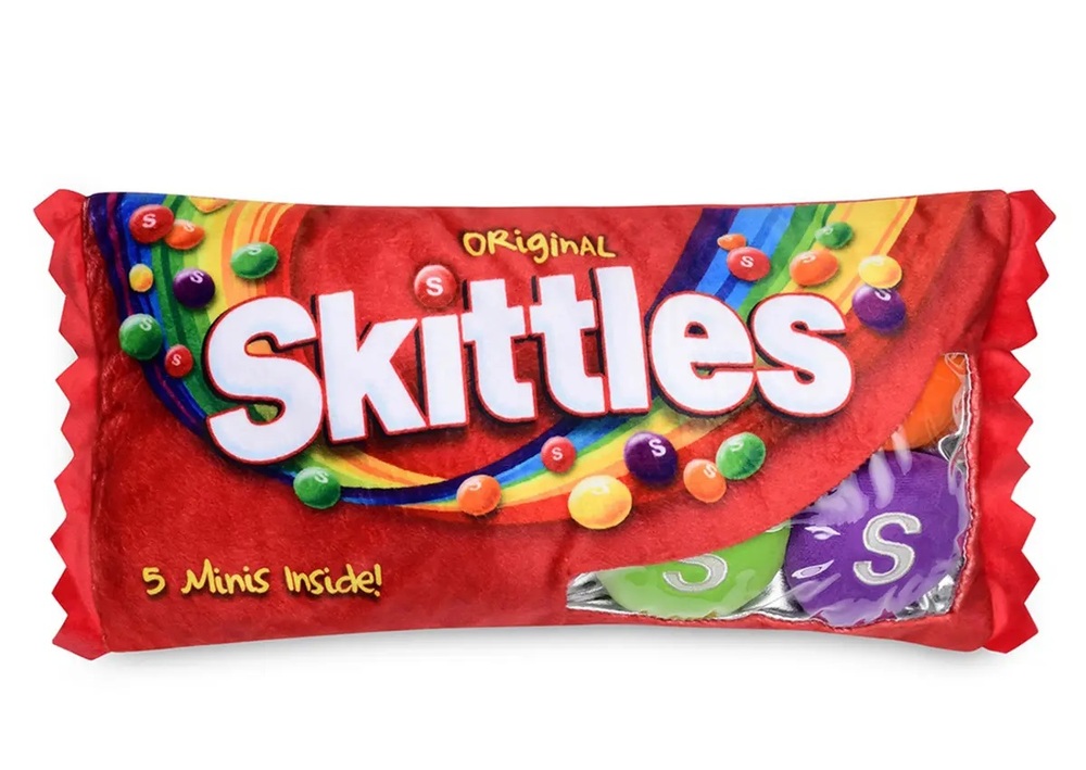 Officially the largest package of Skittles on Earth. This super soft plush recreation of your favorite candy makes for a deliciously comfy pillow. Includes 5 removable candy pieces in a fleece bag.