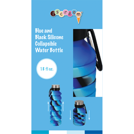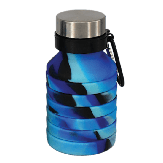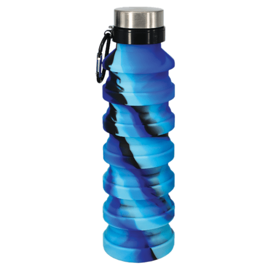 Our blue and black collapsible water bottle is so. stinking. cool! Not only does it feature a really cool swirling design design, but this silicone water bottle is collapsible, making it absolutely perfect for hikes and other adventures. When you're finished hydrating, you can squish it down to half its normal size and tuck it in a backpack or hook it on with its handy carabiner. It makes a great gift!