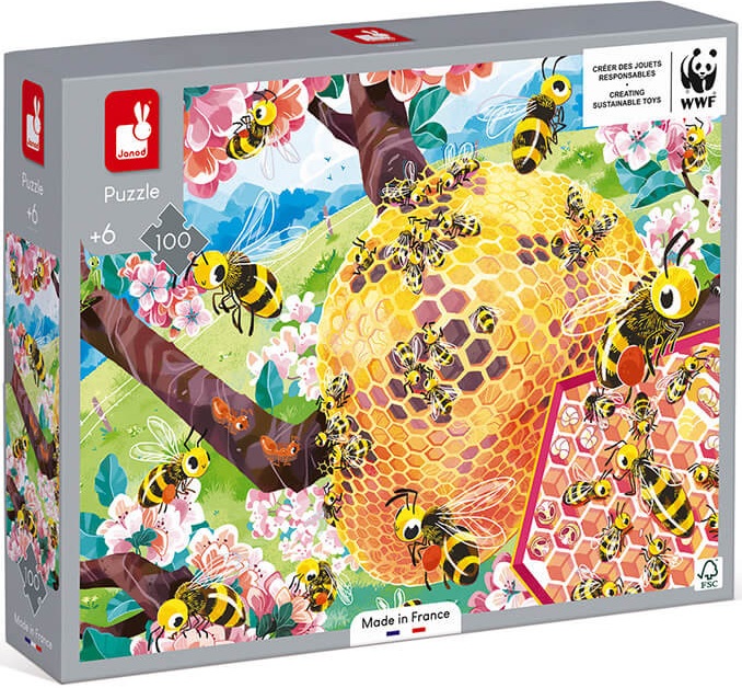 Let's learn more about our friends the bees! This 100-piece cardboard puzzle is all about the busy lives of bees. Designed for children aged 6 and over, this French-made puzzle allows them to discover the daily life of honey producers and take a peek at life inside the hive! A poster is included to help children complete the puzzle. FSC®-certified cardboard (made using wood from sustainably managed forests). Printed with vegetable-based inks. Toy developed in collaboration with WWF®. Janod is supporting WWF®™’s efforts to protect the environment and biodiversity with a new range of toys made from more sustainable materials. We hope this range will inspire the next generation and encourage them to stand up for wildlife and the natural world in the future.