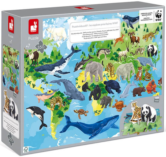 Discover this magnificent, 350-piece giant cardboard puzzle depicting some of the WWF®’s priority species! This puzzle shows the most endangered animals on each continent. It comes with an educational booklet so you can get to know the endangered species and find out about what WWF® is doing to protect them. There are 44 cardboard animals for kids aged 7 and over to put together. Then they can place them on the board to complete the puzzle. The name of the species is shown on the back of each animal figure. The box includes a poster to help children complete the puzzle, as well as a booklet explaining the work of WWF®. Made using FSC®-certified cardboard (from sustainably managed forests) and water-based paint. Toy developed in collaboration with WWF®. Janod is supporting WWF®™’s efforts to protect the environment and biodiversity with a new range of toys made from more sustainable materials. We hope this range will inspire the next generation and encourage them to stand up for wildlife and the natural world in the future.