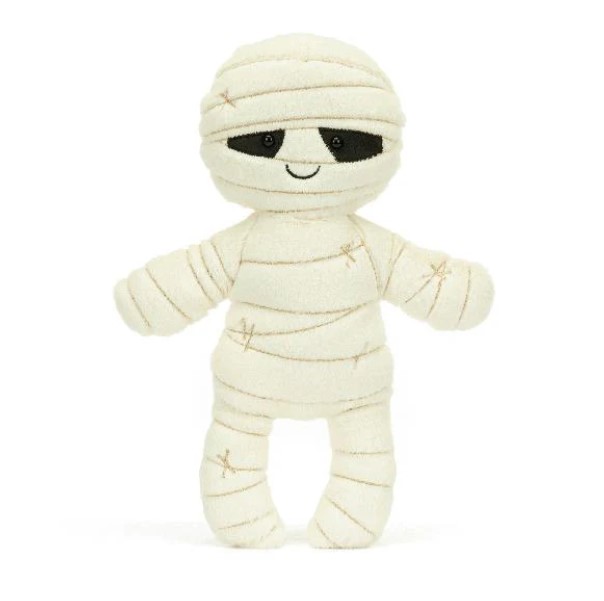 Mummy Bob is all wrapped up in Halloween joy! Covered in soft cream bandages from head to toe with embroidered detail, Bob has a big stitched smile and charcoal eyes peeking through.