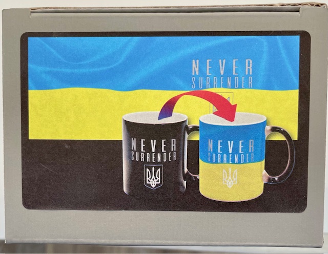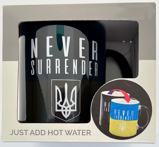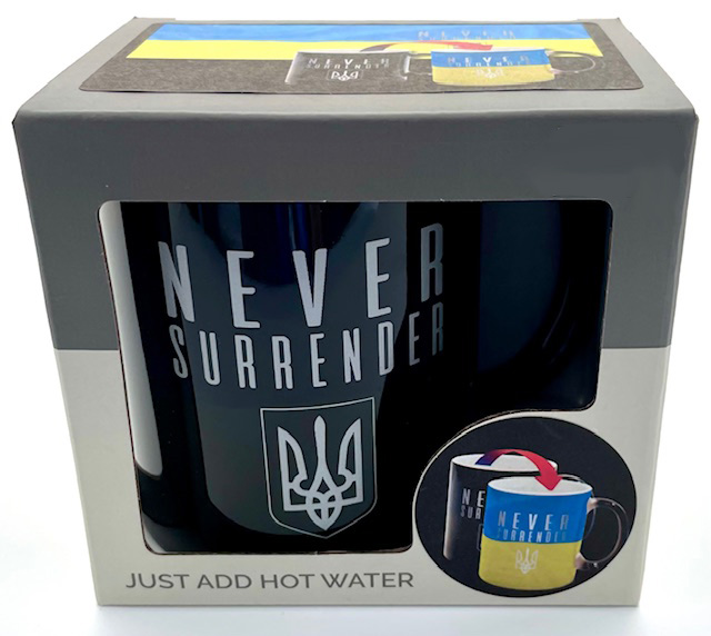 Colour changing mug. Just add hot water and reveal the change from black background to the Ukrainian flag colours of blue and yellow. With text "Never Surrender" and a tryzub.