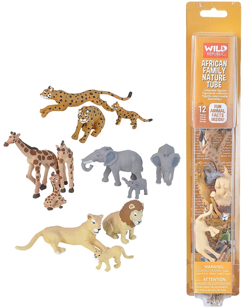 Your child can create their own safari on the Savannah with Wild Republic African Family nature tubes. Help teach conservation and preservation of wildlife animals through play with these replicas. The African families of the elephant, lion, giraffe and cheetah are represented in this tube. These realistic African figurines are 2 1/4” to 3 1/8” nose to tail for the adult elephant, lion, giraffe and cheetah. Their babies measure 1 1/2” to 1 7/8”. perfect for creative play, educational materials and decorations.