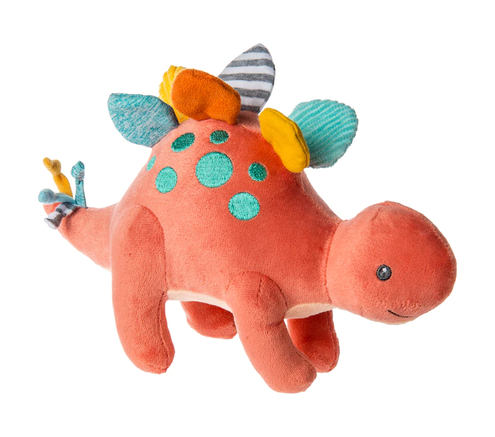 Dinosaurs are always a big hit with little ones and Pebblesaurus are the cutest dinos you’ll find. Decidedly un-ferocious, these dinosaurs will be a baby’s best friend. What’s there to love: Dinosaurs are consumer favorites. These dinos are super friendly. Updated, modern color palette. Exclusive Mary Meyer dino print fabric. He stands tall at 7" with embroidered eyes and body spots. Colorful spikes make this decorative dinosaur a wonderful addition to any nursery. Coral body with colorful embroidered spots. Decorative spikes and knotted ribbons. Machine wash, air dry.