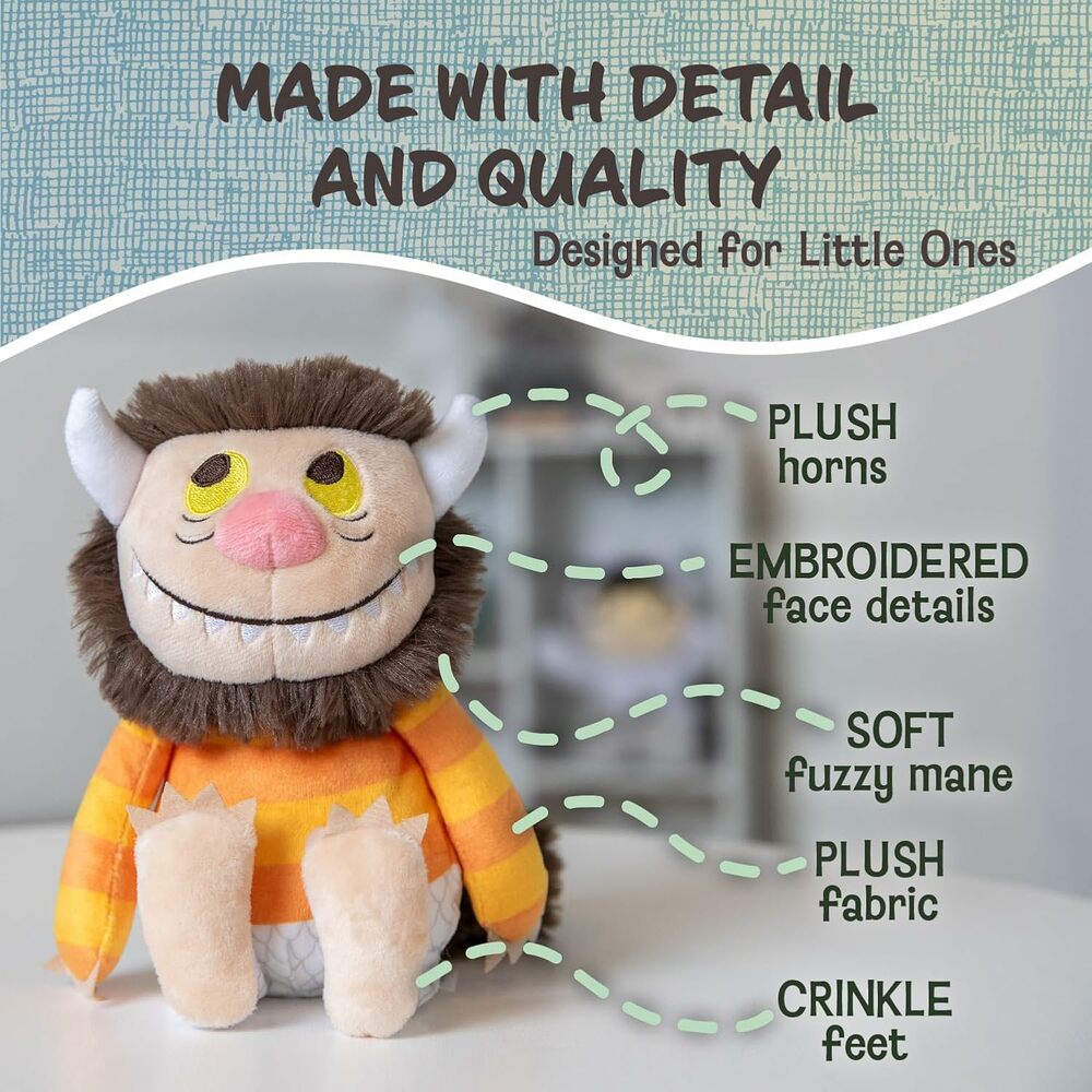 DETAILS: Inspired by "Where The Wild Things Are," Moishe stands 9 inches tall, featuring crinkle feet and a removable hood. This plush toy captures the essence of the classic tale and is perfect for fans of the book.