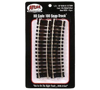 Four HO Scale Code 100 1/2-18" Radius Section Pieces. Features: Track pieces are 4-3/4" long. Easy Snap-Track assembly. Rail is .100" high. Quality precision, evenly spaced black ties and nickel silver rails. Code 100 track is compatible with most code 83 track by using Atlas' Transition Joiners. Universal joiners included.