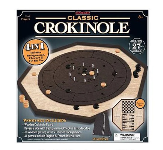 - Wood Set Includes: Wooden Crokinole Board, Reverse side with Backgammon, Checker & Tic-Tac-Toe, 30 Wooden playing disks, Dice for Backgammon.