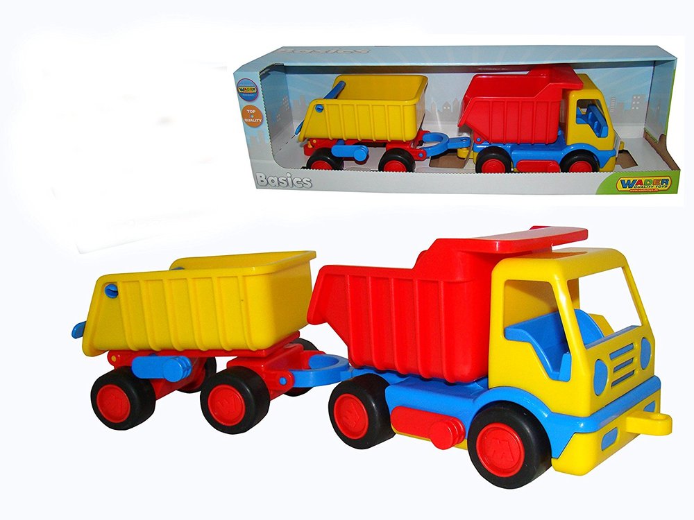 The Wader Basics Dump Truck with Trailer is the real deal, fully equipped to handle your little builder's next big project--no batteries needed! Constructed from high-quality, UV-protected plastic, this trusty toy's rich colors won’t fade even after extended light exposure. Its durable design is stable, sturdy, and easy to clean. The noise-canceling rubber tires are silent and safe on any surface. Wader toys are engineered in Europe, crafted with care to endure everything your child could ever imagine.