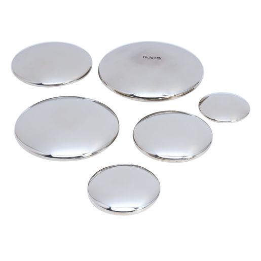 Robustly constructed from stainless steel, these 7 giant silver buttons have a pleasingly rounded discus shape with smooth seamless edges and are graduated in size from 50mm to 140mm diameter. Having a metal construction makes the Sensory Buttons highly durable and with a deluxe feel. They are lightweight, smooth and compellingly tactile to handle. The polished mirror surface provides a slightly curved and distorted reflection which is fascinating for children to observe. Ideal for inspiring creative language, using in imaginative play and constructing fun wobbly stacking towers.