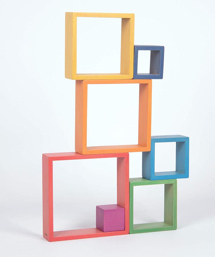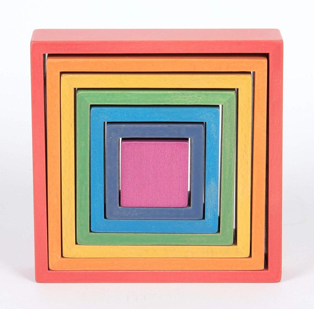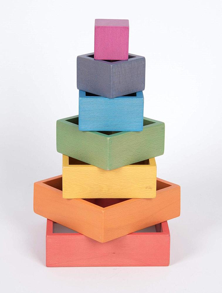This 7-Piece Rainbow square set is a beautiful and versatile wooden stacking and nesting toy. Made from beautifully colored natural beechwood squares, this rainbow-inspired toy is a wonderful addition to open-ended play resources that inspire creativity, language and design skills. Children love the bright colors, smooth texture and shapes of these stackers. They can be used on their own or incorporated into games or role play with other manipulatives, figures or toys. The pieces nest together perfectly.