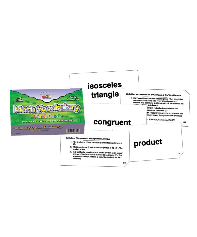 Reinforce understanding of essential math terms and application with this multi purpose 179 double-sided card deck. Students can practice with math terms and true/false statements of increasing difficulty relevant to key math words. Great for cumulative review and test ready practice. Cards can be used at 3 levels of play and relate to geometry, probability, fractions, decimals, measurement, algebra, and more!