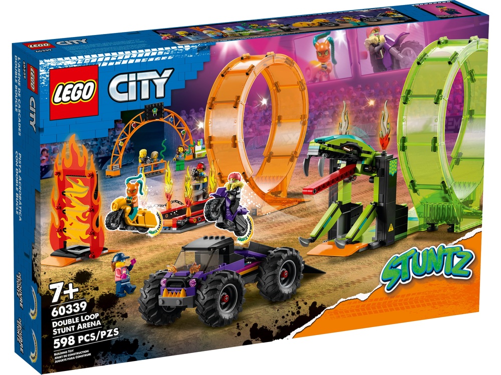This LEGO® City Double Loop Stunt Arena (60339) playset is packed with features and comes with 2 flywheel-powered stunt bikes and a monster truck with a ramp for performing real stunts. Arena props include a toy wall of flames, snapping snake loop and a loop of fire, plus lots of cool accessories. Just add the 7 minifigures, including 2 stunt bikers, for exciting shows and competitions.