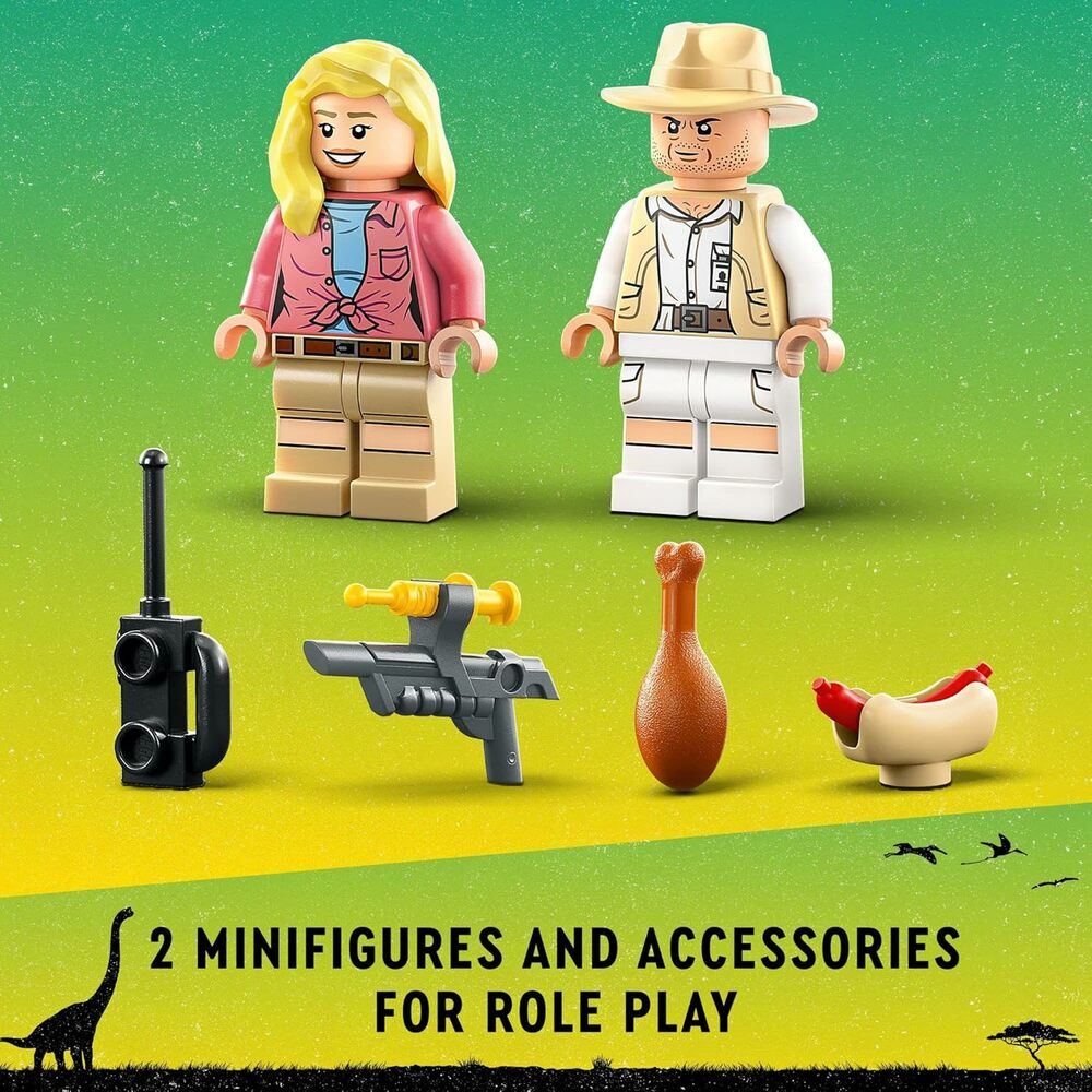 2 minifigures – Dr. Ellie Sattler and Robert Muldoon, plus a frog figure. Accessory elements include a toy walkie-talkie, tranquilizer, hot dog, dinosaur poop and a dinosaur egg in a buildable nest
