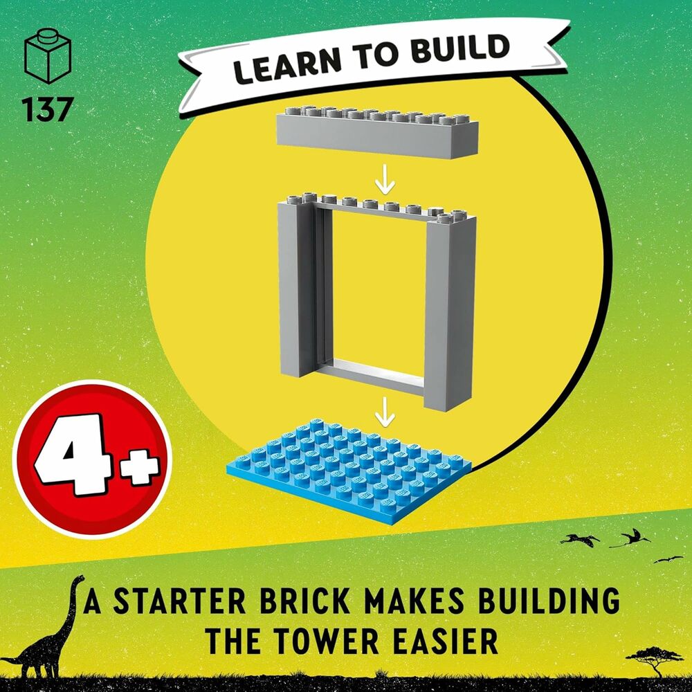 Playful features – The dinosaur pen features a tower with a Starter Brick base to make building easier, a winch with a feeding basket, a gate for the off-roader and a fence with a breakout function.