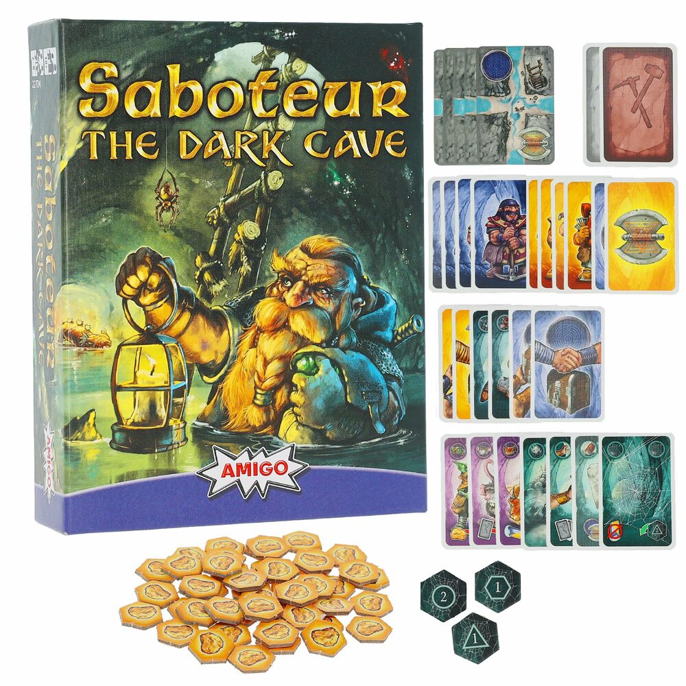 Saboteur: The Dark Cave is a standalone game that recreates the feel of Saboteur. At the start of the game, each player is assigned to a clan, although possibly they will be a saboteur for the other clan. Starting from the mine card in the center of play, you take turns laying down tunnel cards to build outward from the mine toward the four corner cards, only one of which is the exit. In addition to building new tunnels, you'll play cards to give yourself equipment, place monsters in front of others, discover who's actually on your clan, and reveal the exit before trudging all the way there. As soon as you leave the mine, you reveal your true identity, with any gold you have going toward your clan's total. As soon as all members of a clan have left, the game ends, and whichever clan has the most gold wins.