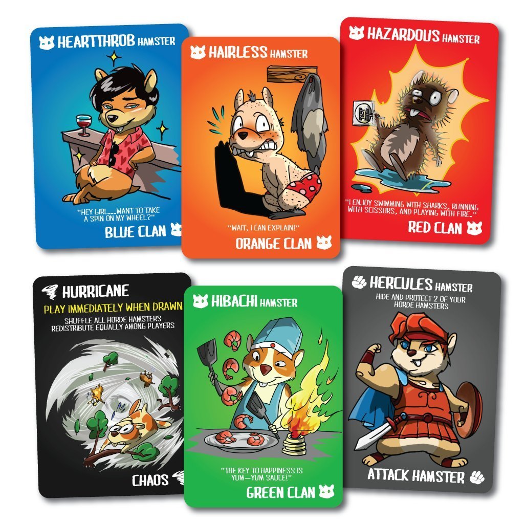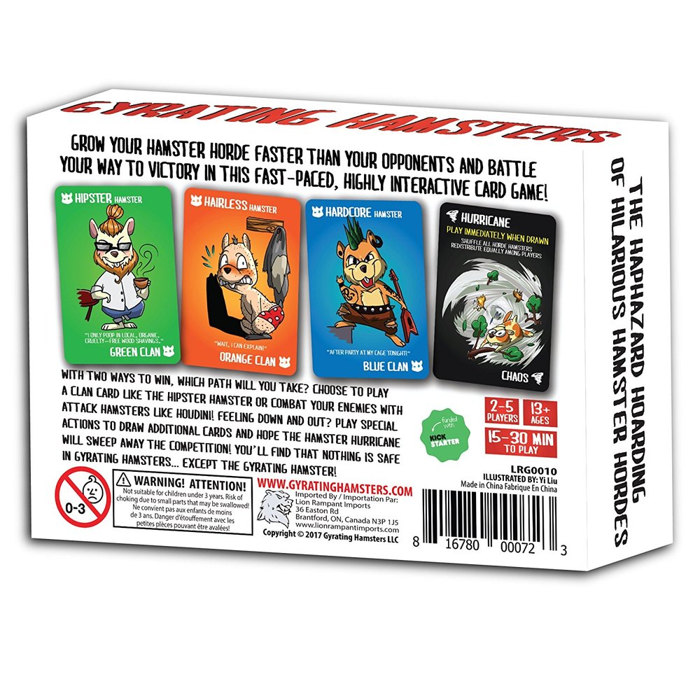 With two ways to win, which path will you take? Choose to play a clan card like the Hipster Hamster or combat your enemies with attack hamsters like Houdini! Feeling down and out? Play special actions to draw additional cards and hope the hamster Hurricane will sweep away the competition! You'll find that nothing is safe in Gyrating Hamsters... except the Gyrating Hamster!